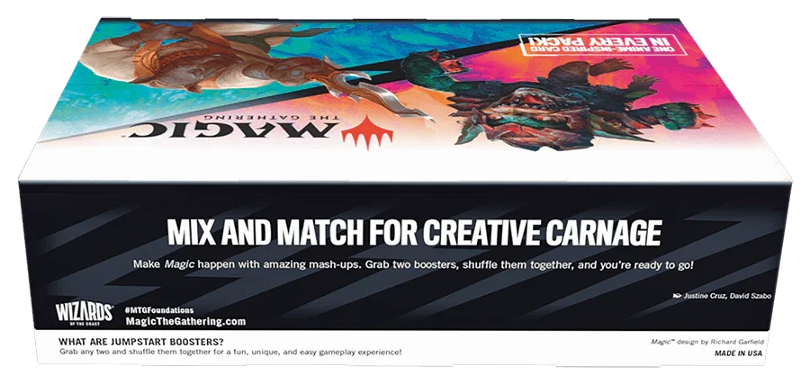 The best time for your community’s first Magic game is now. Dive into Foundations, and experience quintessential Magic: The Gathering by playing with and collecting cards selected to give every player the advantage. Whether a past, present, or future Magic player, Foundations invite you to share your spark!With Jumpstart, playing Magic is a breeze: all two players need to do is crack two packs, shuffle, and they’re ready to begin! Whether players are learning the ropes or spell-slinging pros, Foundations Jumpstart brings a fresh wave of fun for everyone at the table.Features:• A full display of Jumpstart Boosters supports players who want to explore tons of fun combinations!• Each booster has 1 of 46 possible themes—combine them for wild mash ups.• Just grab 2 boosters, shuffle them together, and play!Contents:• 14 x Cards Per Pack
