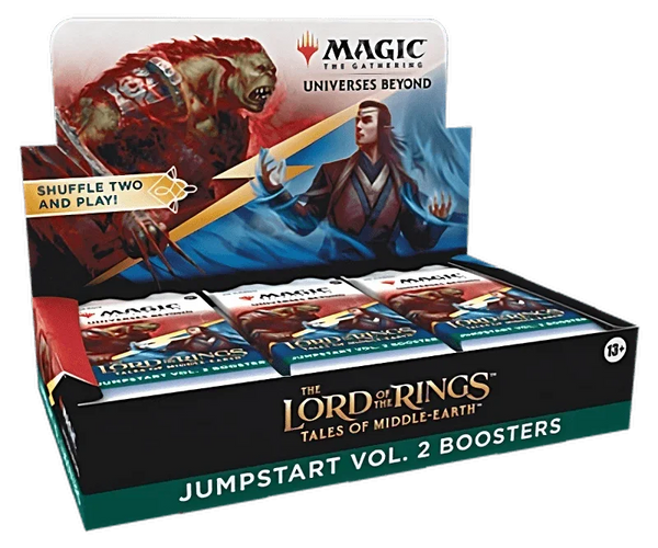 The Lord of the Rings: Tales of Middle-earth Jumpstart Vol. 2 Booster Box contains 18 The Lord of the Rings: Tales of Middle-earth Jumpstart Vol. 2 Boosters. Each booster has a theme. Just grab two packs and shuffle them together for wild combos and a unique gameplay experience that’s great for a quick game, for long-time fans looking to jump back in, or for a fun way to learn to play. Each The Lord of the Rings: Tales of Middle-earth Jumpstart Vol. 2 Booster contain 20 Magic cards (including all the lands you need to play). In every pack, you’ll find 2 Rare cards (1 Rare card designed for Jumpstart boosters and 1 Rare or Mythic Rare from the main set), and 2 Land cards with a shining Traditional Foil treatment. This product does not contain Serialized Ring cards, including the Serialized Elven, Dwarven, or Human Sol Ring cards, and The 1 of 1 Ring (Serialized 001 of 001). Serialized Elven, Dwarven, and Human Sol Ring cards can only be found in some The Lord of the Rings: Tales of Middle-earth Collector Boosters. Only one card has been printed of The One Ring (Serialized 001 of 001), and this card can only be found in one English-Language Collector Booster. Non-serialized Ring cards are mechanically identical to their Serialized versions. If you’re looking to maximize your mashups, The Lord of the Rings: Tales of Middle-earth Jumpstart Vol. 2 Boosters can be combined with packs from any other Jumpstart product.