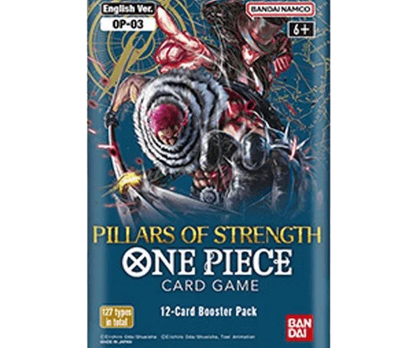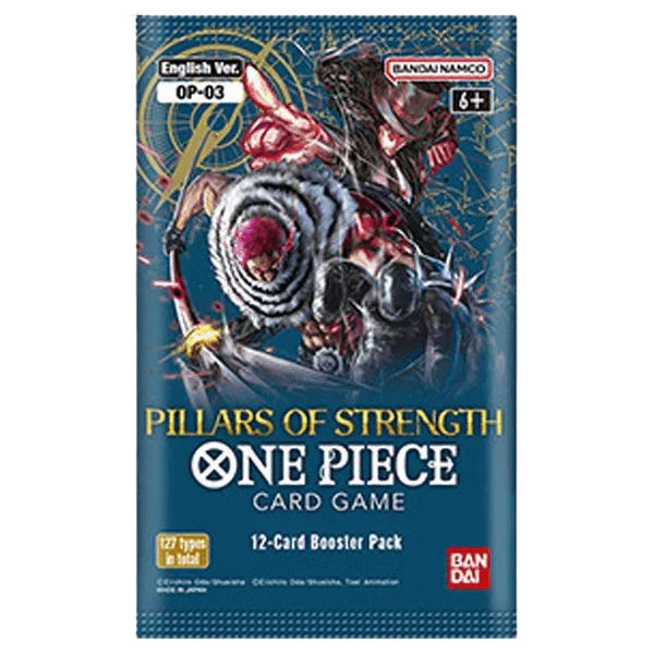 The third One Piece Card Game booster is now available, themed on PILLARS OF STRENGTH! The mighty enemies that confronted Luffy and his crew joins the fray!A third booster themed the strong enemies of the past!Featuring characters from Water 7, East Blue, Big Mam Pirates!Also includes a number of cards that can enhance the deck [ST-07] to be released simultaneously!Full-fledged inclusion of the new “Yellow” color cards!Enhancing the decks to be released simultaneously and including new combinations of multicolored leaders!Adding a new range of strategies through combos never seen before!NEW TYPE OF ALT-ART CARDS!New style of alt-art cards from OP-03 This set includes 4 types of cards with the most requested design!Special Card: x4Leader: x8Common: x45Uncommon: x32Rare: x26Super Rare: x10Secret Rare: x2127 card types*This product also includes alternative art and parallel design cards from the above types.