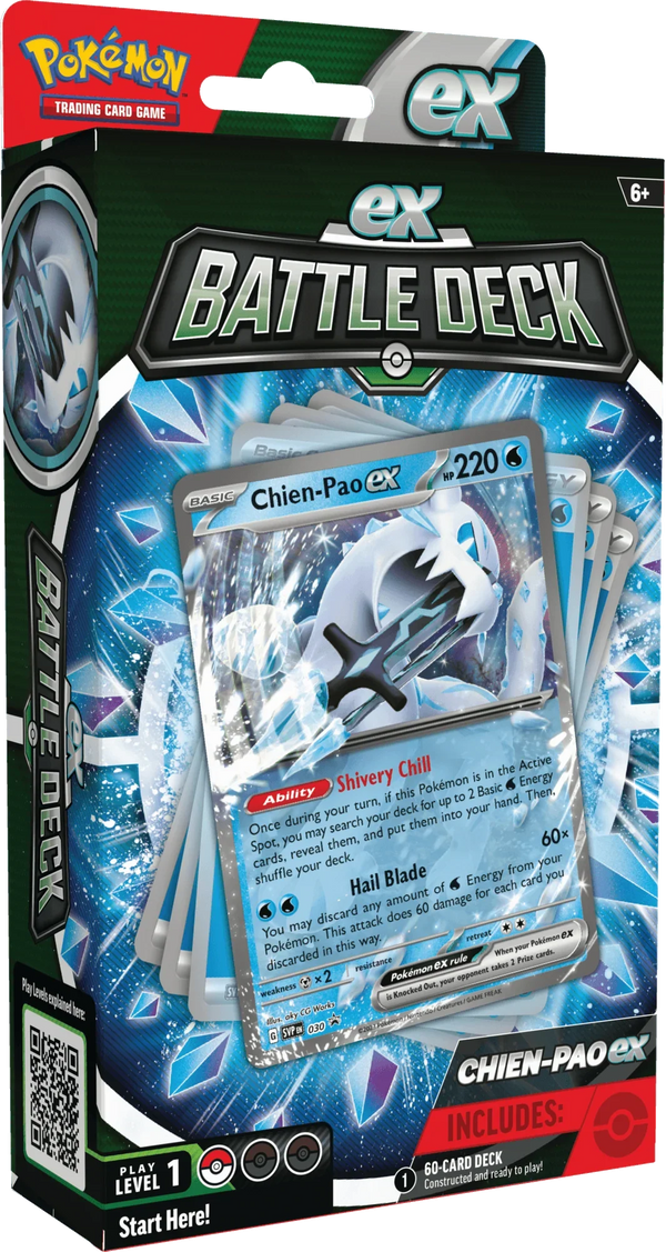 Mighty Pokémon ex Battle for Victory! Powerful Pokémon ex are ready to charge onto the battlefield in two new Pokémon TCG: ex Battle Decks featuring Chien-Pao ex and Tinkaton ex! Each 60-card deck is led by an exceptional Pokémon ex and includes everything you need to play right away. Let the battle begin! Each Pokémon TCG: Chien-Pao ex Battle Deck includes: • 1 ready-to-play 60-card deck • 3 reference cards • 1 rules booklet • 1 single-player playmat • 1 set of damage counters • 1 large metallic coin • 1 deck box • 1 strategy sheet • 1 code card to play this deck online