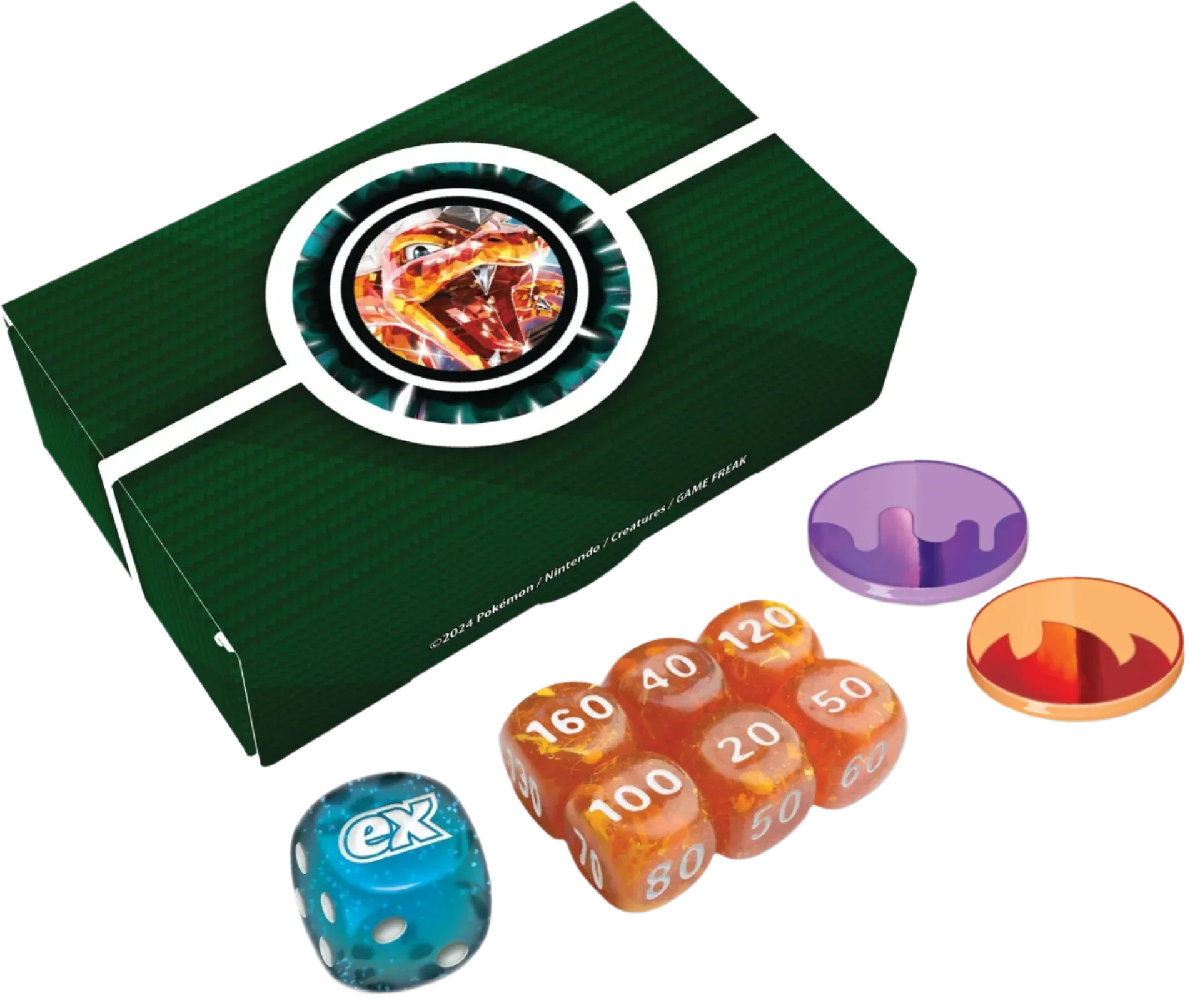 Charizard ex Blazes Forth with Burning Vengeance! In this box, you’ll find: 1 ready-to-play 60-card deck 6 damage-counter dice1 coin-flip die2 coin condition markers1 deck box1 accessory box1 strategy sheet1 code card to play this deck online