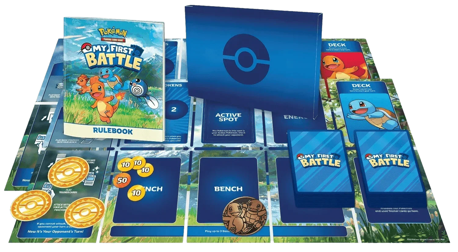 • 2 mini decks of 17 cards each• 2 laminated playmats designed for single-player use• A rulebook• 1 large metallic Pokémon coin• A sheet of damage counters• 6 Prize tokens