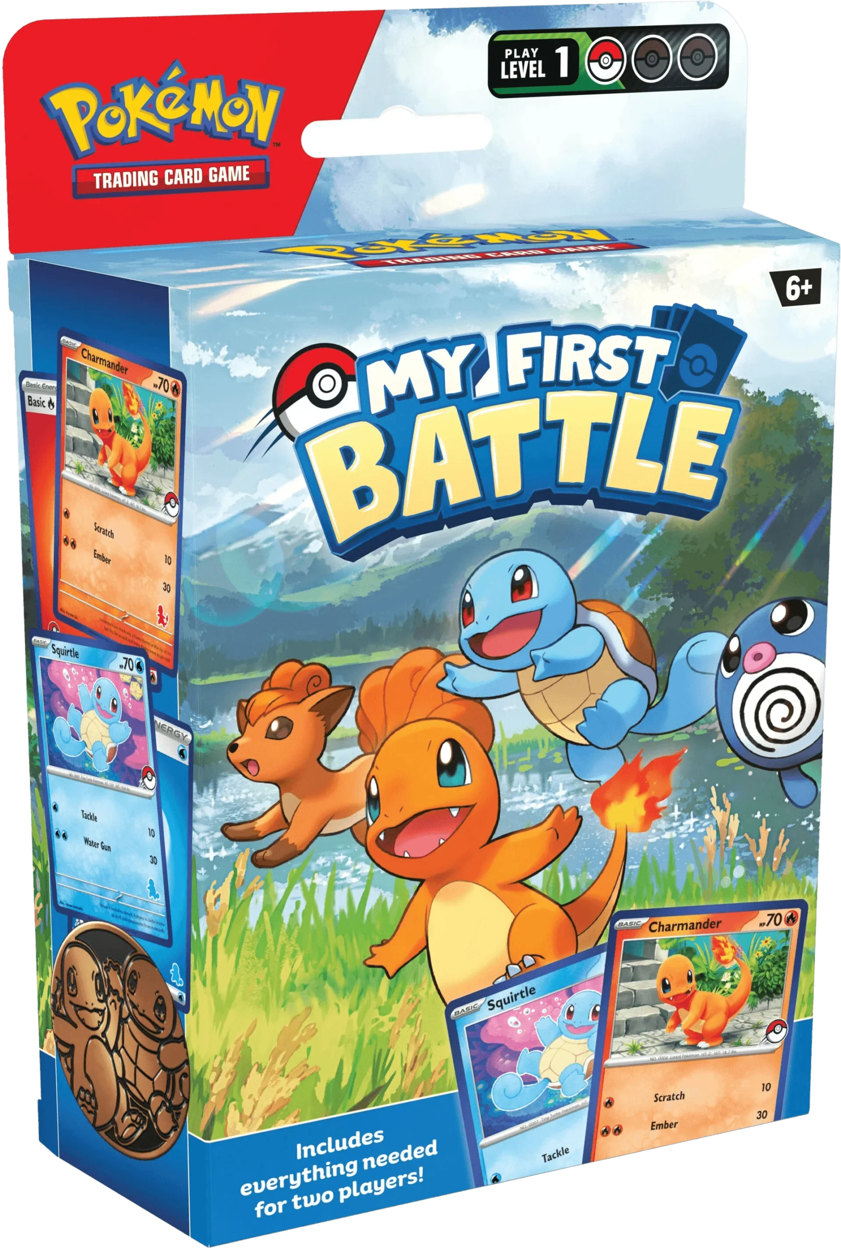Your Pokémon TCG adventure starts here! If you’ve always wanted to play the Pokémon Trading Card Game with family and friends, the Pokémon TCG: My First Battle set is the perfect introduction. With a streamlined game and foolproof guidance, you’ll be ready to train and battle together. Everything you need for two players is included! Inside, you’ll find everything two people need to play: