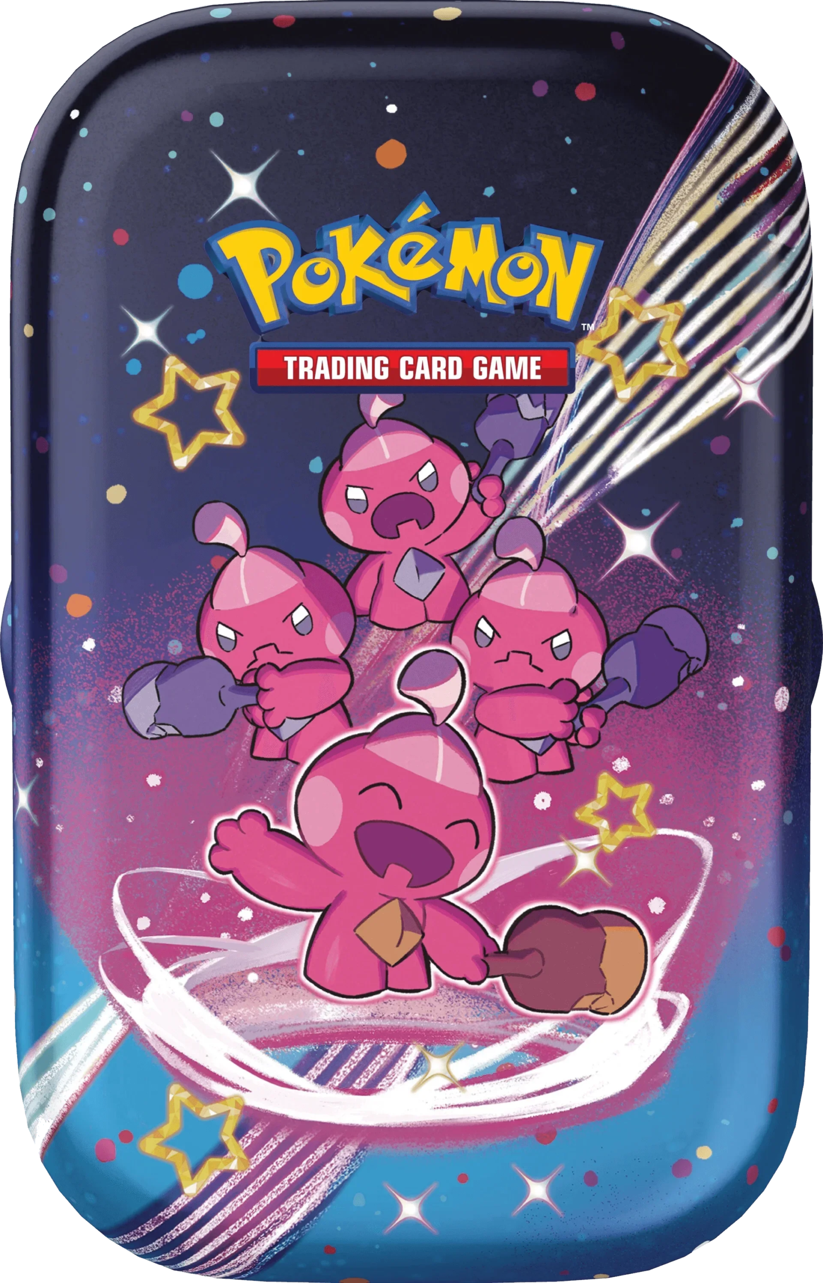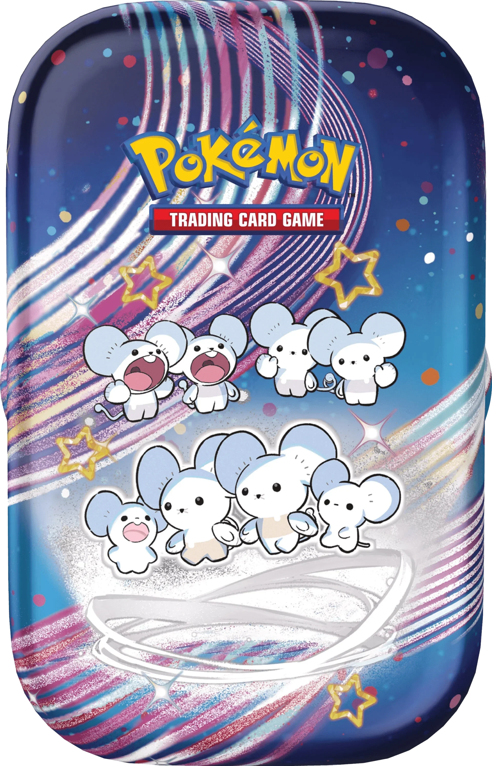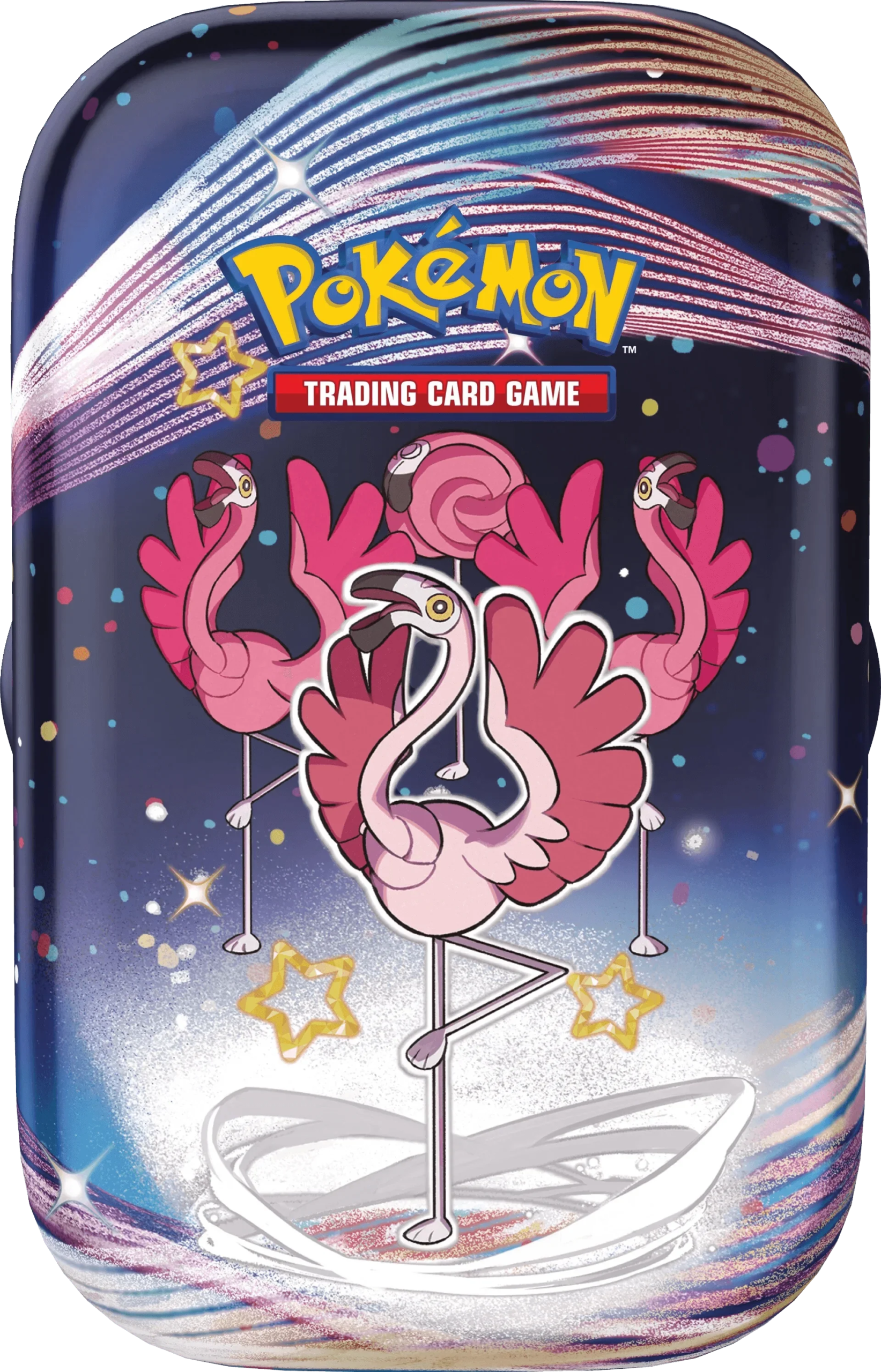 Includes two Scarlet & Violet—Paldean Fates booster packs, one sticker sheet and one art card matching the tin, featuring Maushold, Smoliv, Tinkatink, Finizen or Flamigo.