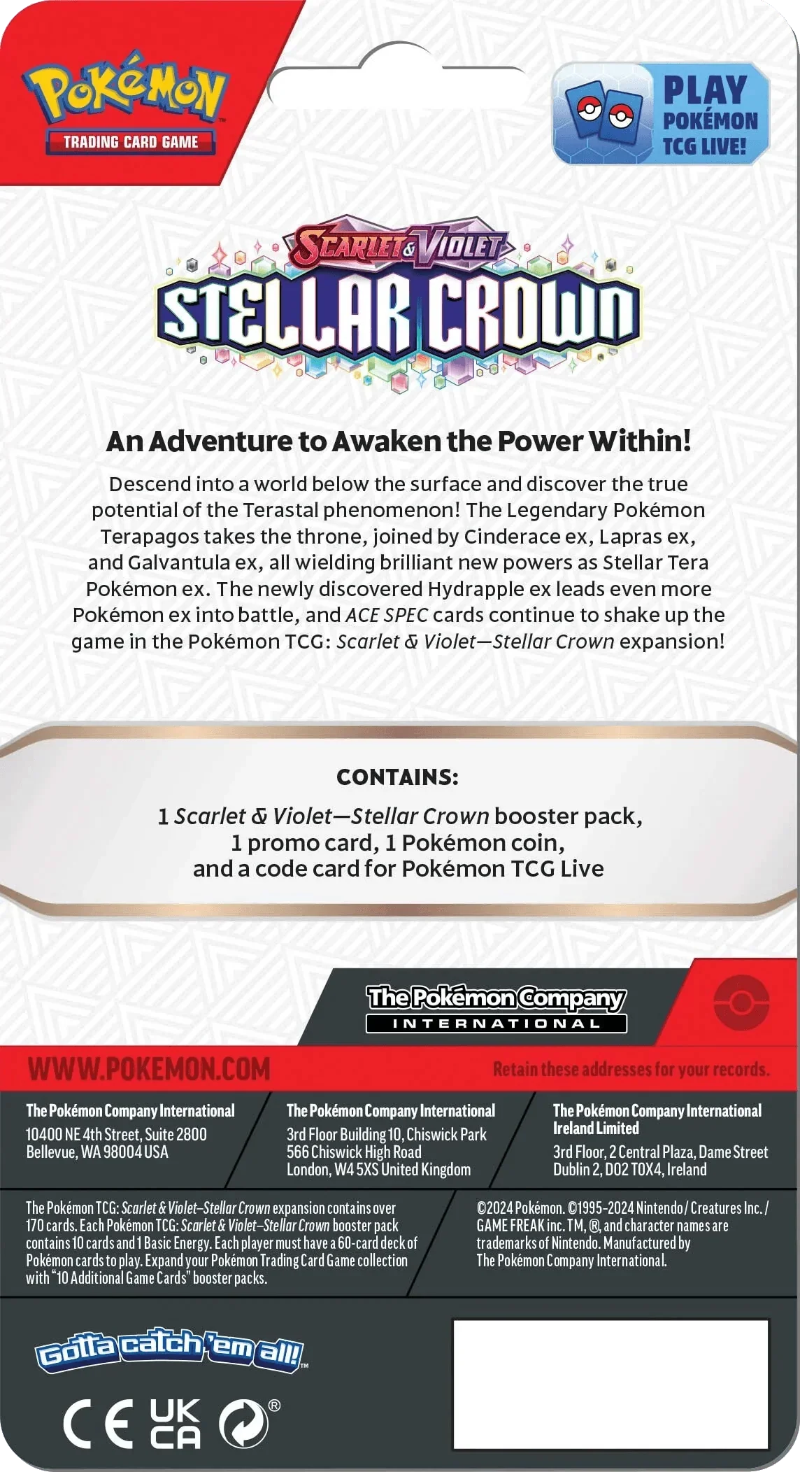Descend into a world below the surface and discover the true potential of the Terastal phenomenon! The Legendary Pokémon Terapagos takes the throne, joined by Cinderace ex, Lapras ex, and Galvantula ex, all wielding brilliant new powers as Stellar Tera Pokémon ex. The newly discovered Hydrapple ex leads even more Pokémon ex into battle, and ACE SPEC cards continue to shake up the game in the Pokémon TCG: Scarlet & Violet—Stellar Crown expansion.