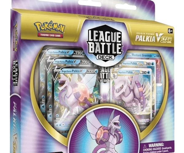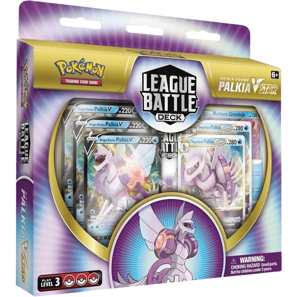 The Pokémon TCG: Origin Forme Palkia VSTAR League Battle Deck includes:• A full, playable 60-card deck loaded with power cards• 3 foil cards featuring Origin Forme Palkia V• 2 foil cards featuring Origin Forme Palkia VSTAR• 1 foil card featuring Radiant Greninja• 1 deck box• 2 coin condition markers• 6 damage-counter dice and 1 competition-legal coin-flip die• 1 acrylic VSTAR marker• 1 strategy sheet• A code card for Pokémon Trading Card Game Live