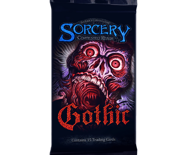 A showcase 36 pack booster box, using ‘The Void’ art for Ian Miller and the Gothic logo prominently in red. The box is designed to be slightly more substantial than regular TCG boxes and features a magnetic seal, so our players can customize the box and use it for impromptu storage.Each randomized booster pack features 15 cards, with a chance of a unique card, a highly coveted foil, or even a rare curio. ‘The Screamer’ adorns each pack, so players can celebrate or commiserate, screaming with agony or ecstasy, as they crack packs looking for the card that completes their collection!With 440 all-new cards, the gameplay meta shifts significantly, unlocking new gameplay options as well as ensuring existing cards see new life as we open up a wealth of gameplay options with thirteen new avatars!Features:• Gothic is a full-blown expansion to Sorcery: Contested Realm, and the cards from Alpha, Beta, and Arthurian Legends are all cross-compatible with this new set.• The box is designed to be slightly more substantial than regular TCG boxes and features a magnetic seal.• 440 all-new cards, allowing players to unlock new gameplay options.Contents:• 15 x Cards Per Pack