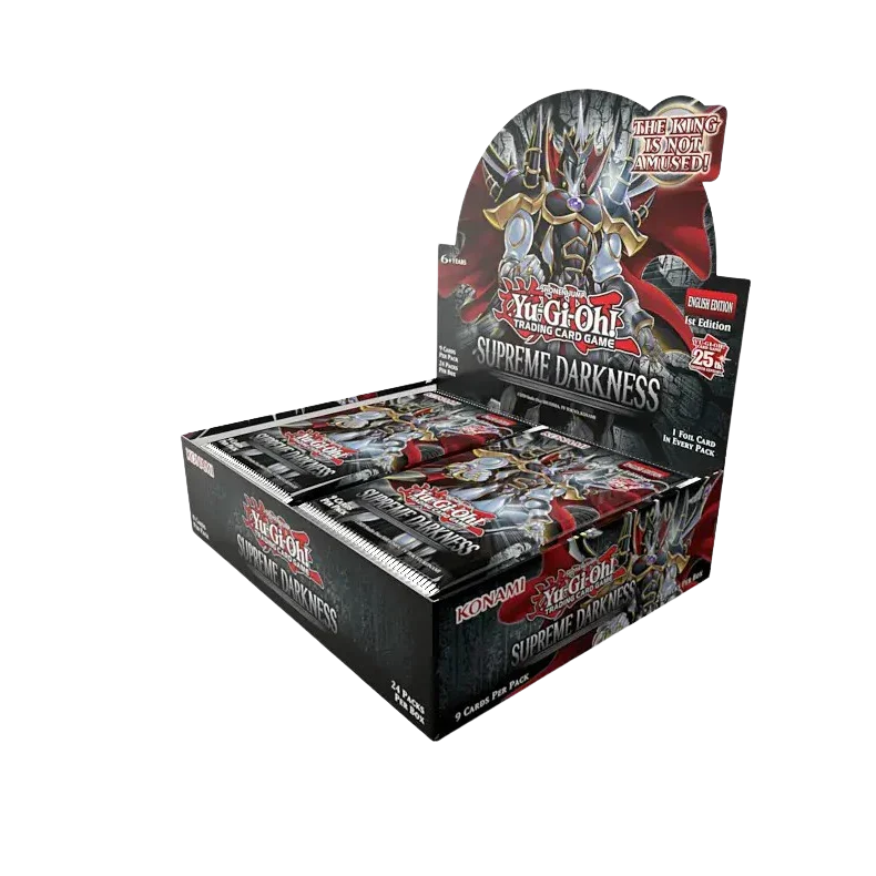 The King is not amused…but he will be – and you will, too! – with the brand-new “Evil HERO” monsters coming in Supreme Darkness!Supreme King Jaden’s “Evil HERO” monsters are back in a big way! Evil versions of Elemental Heroes Bubbleman and Prisma are coming, and the Supreme King’s new version of Neos, which has the power to take over your opponent’s monsters! There are plenty of “Evil HERO” Fusion Monsters to choose from, and this set adds even more, plus new support cards to make it easier than ever.If you’re looking for something in the fast lane, it’s time to speed back into action with new “Spheroid” cards that make Synchro Summoning a breeze! There are two new Pendulum/Tuner Speedroid monsters, plus a couple of new Synchro Monsters styled after Yugo’s favorites, including the biggest “Clear Wing” Synchro Dragon yet. Put the pedal to the metal and leave your opponents in the dust!Fans of Synchro Summoning can also grab new “Crystron” monsters, including a new Synchro Monster. Keep an eye out for a new Level 2 Tuner that can Special Summon a “Crystron” anytime your opponent activates an effect, then you can immediately perform a Synchro Summon!And an all-new theme that are the masters of bouncing around the field makes its grand debut in Supreme Darkness. This Deck works by placing its Continuous Trap Monsters straight into your Spell and Trap Zone. As face-up Continuous Traps, they give constant buffs to all your Warrior monsters. But when you want, these Trap Cards can spring to life as Warrior monsters themselves, then bounce back to the safety of the Spell and Trap Zone when things get too hectic, ready to pop out again when the time is right. You can look forward to all of this and so much more that is yet to emerge from the Supreme Darkness! Supreme Darkness has 101 new cards in total, including a brand-new World Premiere theme that you won’t want to miss. It also continues the 25th Anniversary Celebration by including 25 Quarter Century Secret Rares, including 1 special card! Features:• Supreme Darkness has 101 new cards in total, including a brand-new World Premiere theme that you won’t want to miss. • Set continues the 25th anniversary celebration by including 25 Quarter Century Secret Rares, including 1 special card!• There are 101 cards across the whole set: 50 Commons, 26 Super Rares, 14 Ultra Rares, 10 Secret Rares, 1 Special.Contents:• 9 x Cards Per Pack